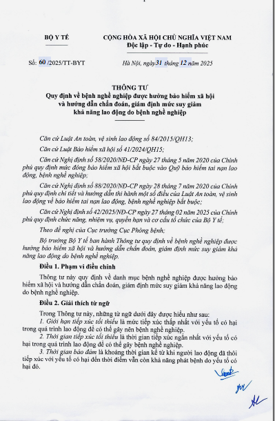 quantri Cập nhật thông tin mới nhất: Quy định về bệnh nghề nghiệp được hưởng bảo hiểm xã hội và hướng dẫn chẩn đoán, giám định mức suy giảm khả năng lao động do bệnh nghề nghiệp: Theo thông tư 60/2025/TT-BYT, ban hành ngày 31 tháng 12 năm 2025. Kính mời quý bệnh nhân, khách hàng và quý đồng nghiệp quan tâm tham khảo và thực hiện.