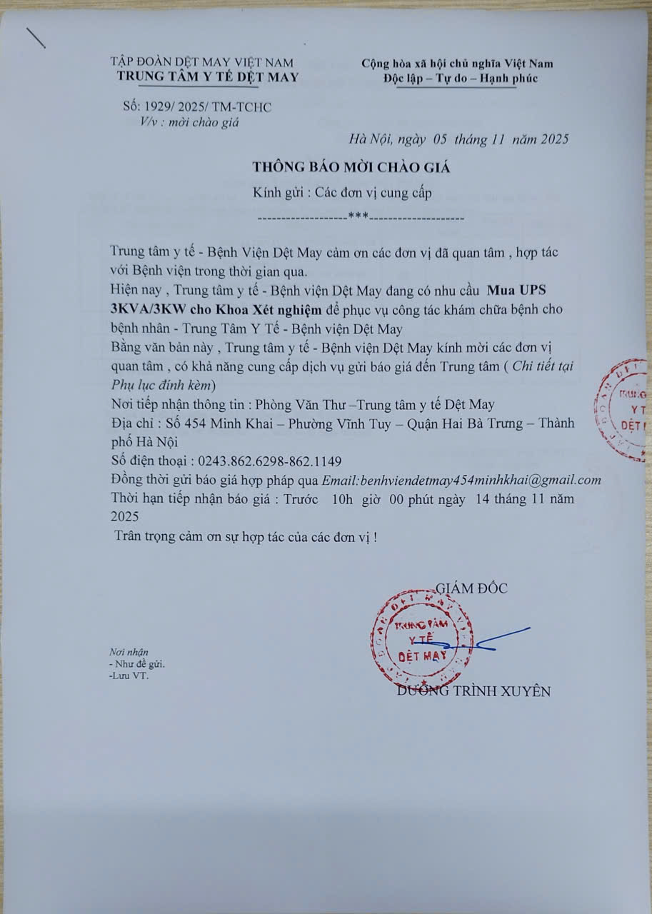 Thông báo mời chào giá: Mua thiết bị ký điện tử phục vụ hoàn thiện bệnh án điện tử tại Bệnh viện Dệt May