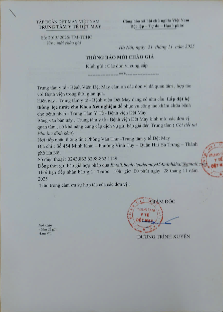 Thông báo mời chào giá: Lắp đặt hệ thống lọc nước cho Khoa Xét nghiệm để phục vụ công tác khám chữa bệnh cho bệnh nhân - Trung tâm Y tế - Bệnh viện Dệt May