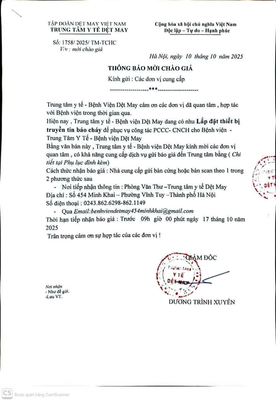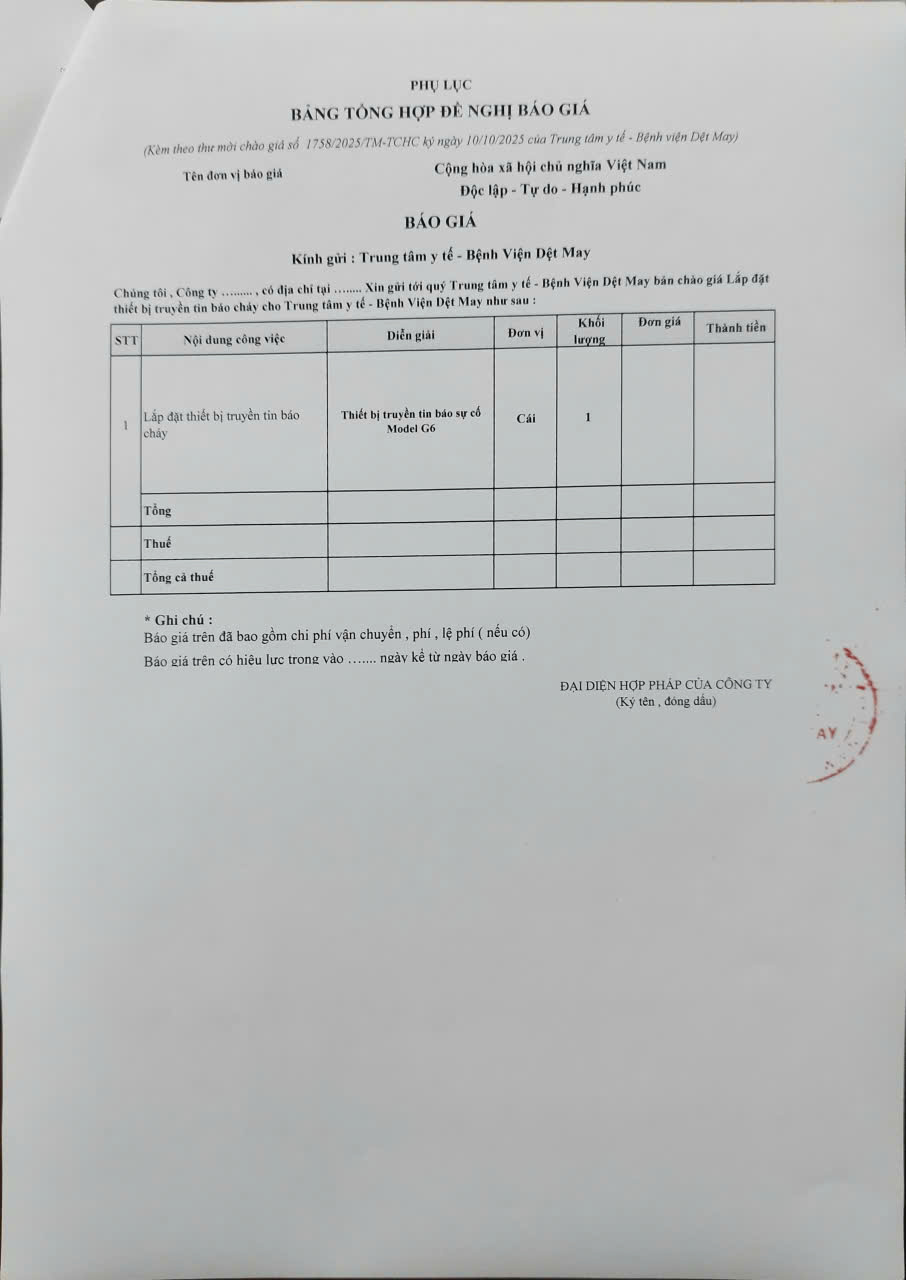 Thông báo mời chào giá: Lắp đặt thiết bị truyền tin báo cháy để phục vụ công tác PCCC-CNCH cho Bệnh viện - Trung tâm Y tế - Bệnh viện Dệt May