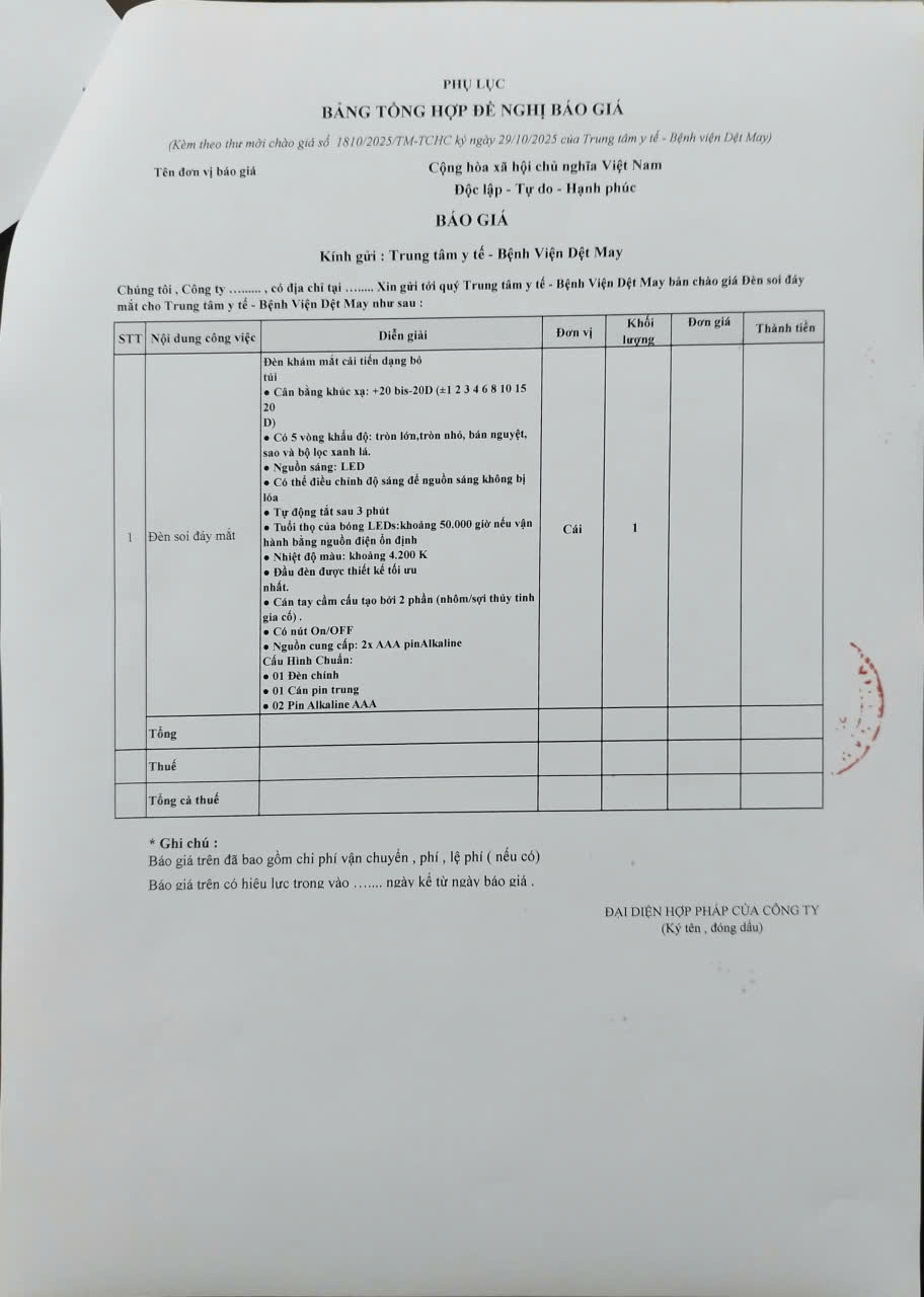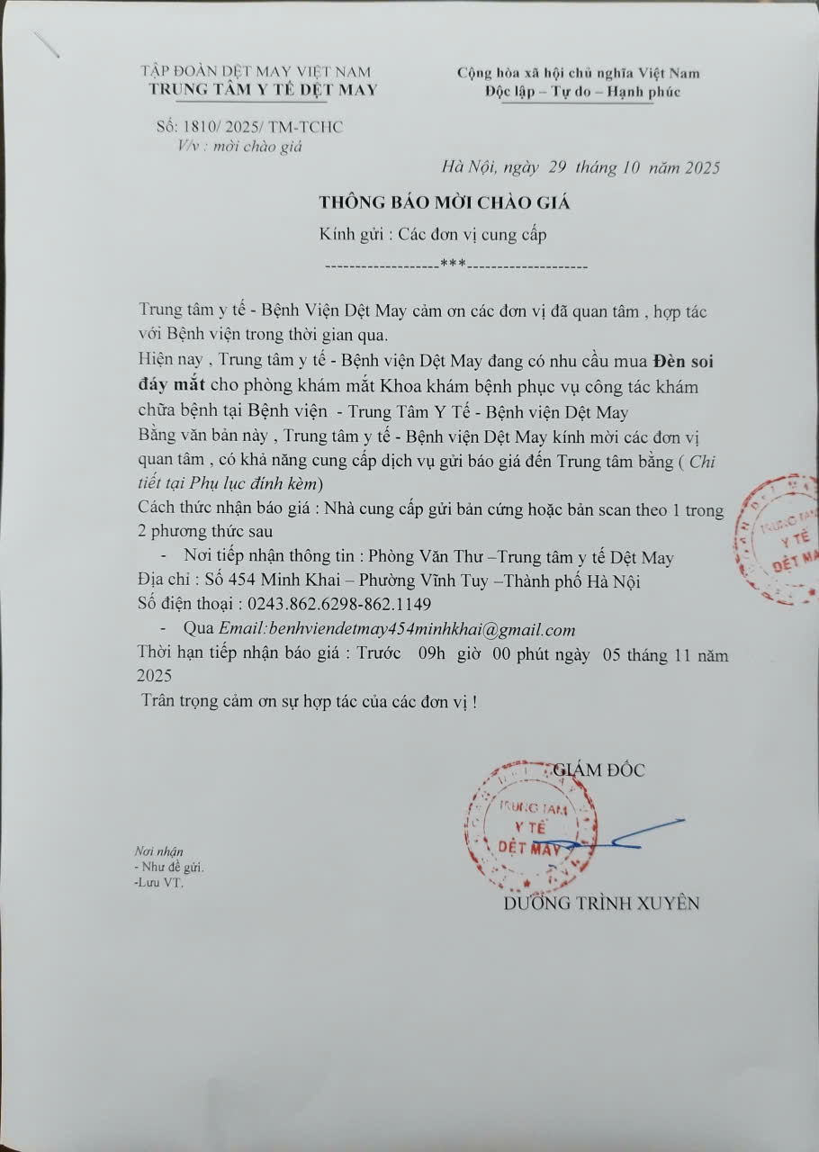 2. Thông báo mời chào giá: Mua đèn soi đáy mắt cho phòng khám mắt Khoa khám bệnh phục vụ công tác khám chữa bệnh tại Bệnh viện Dệt May