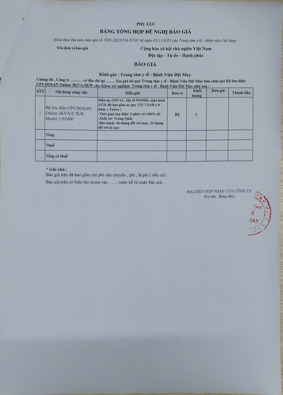 Thông báo mời chào giá: Mua UPS 3KVA/3KW cho Khoa Xét nghiệm để phục vụ công tác khám chữa bệnh cho bệnh nhân