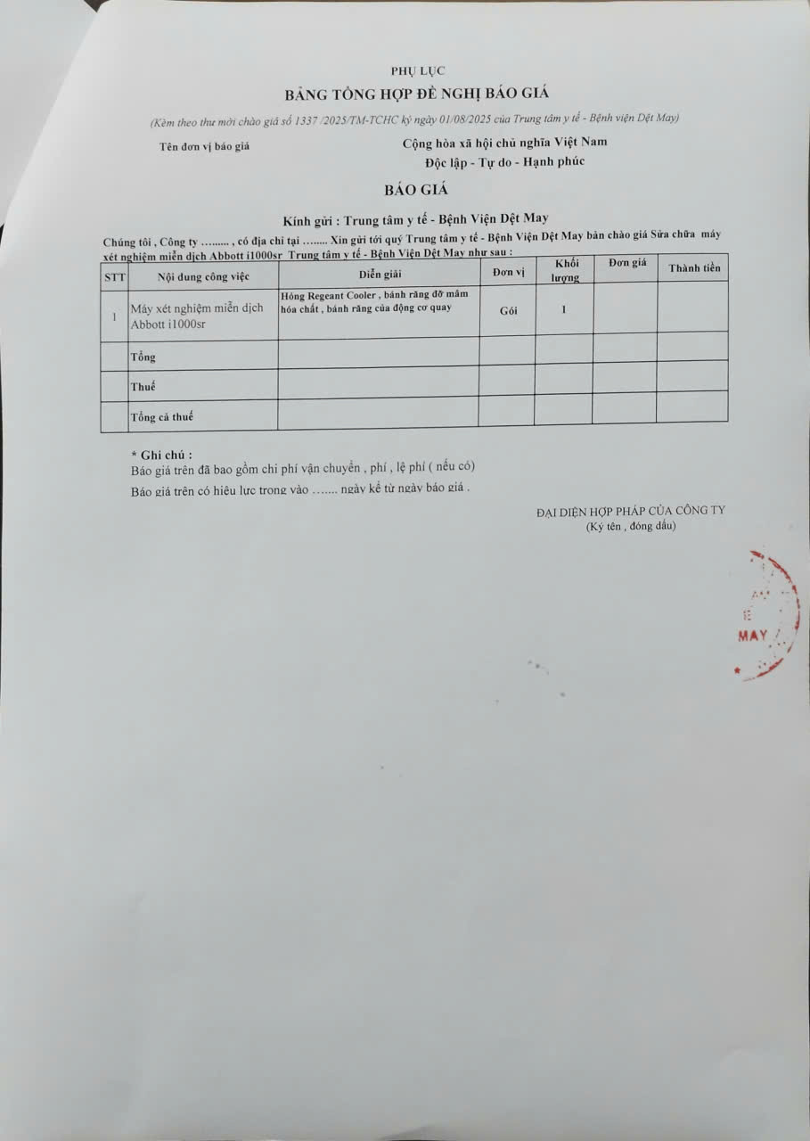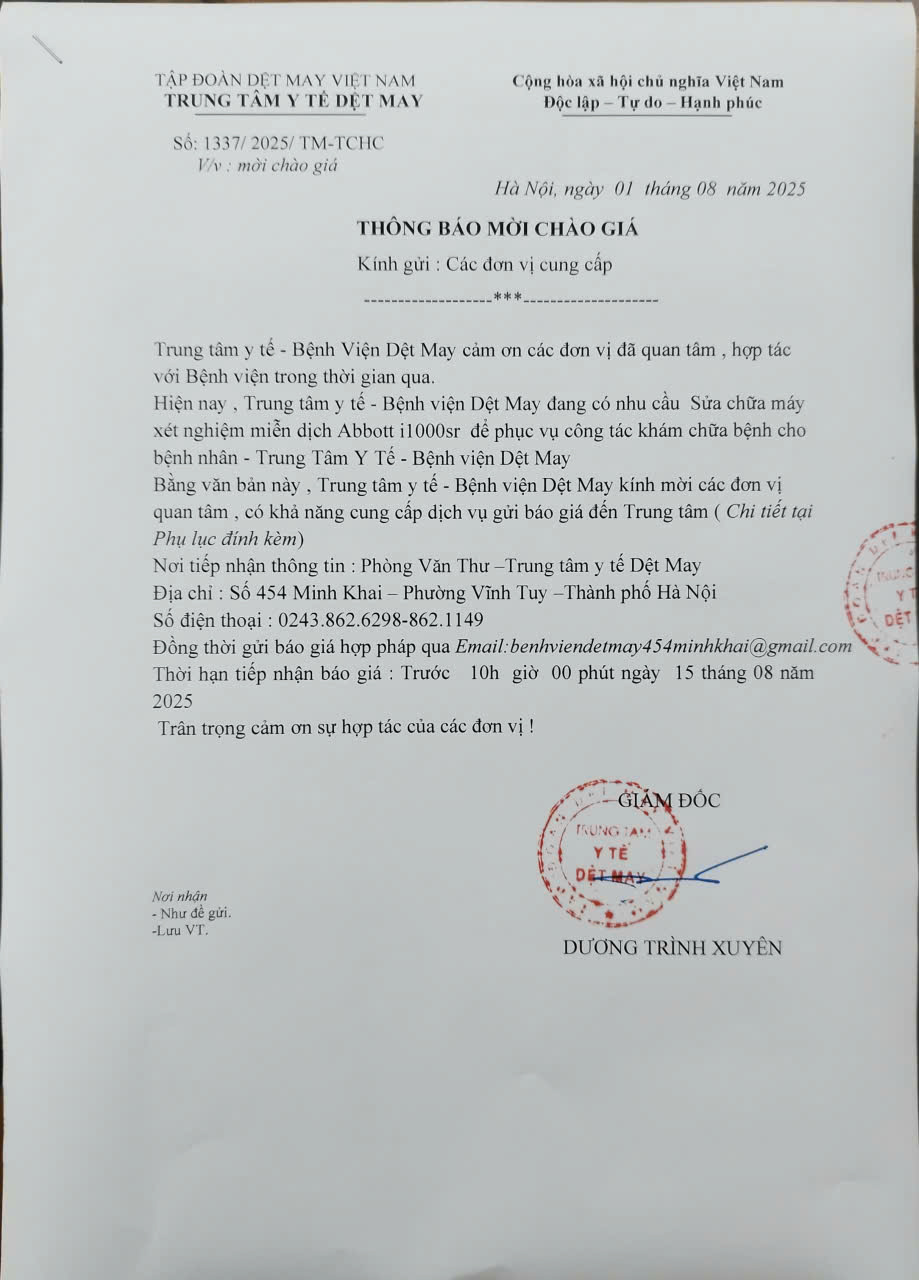 Thông báo mời chào giá: Sửa chữa máy xét nghiệm miễn dịch Abbott i1000sr để phục vụ công tác khám chữa bệnh cho bệnh nhân - Trung tam Y tế - Bệnh viện Dệt May